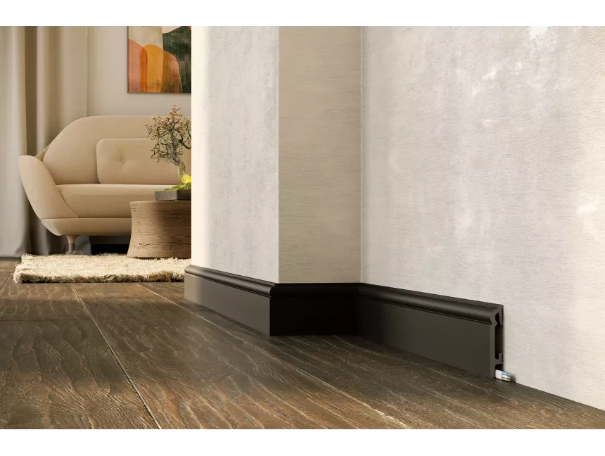 Wysokość 8 cm sprawia, że listwa prezentuje się wyjątkowo efektownie, jednocześnie skutecznie maskując szczeliny dylatacyjne, nierówności przy podłodze oraz przewody.