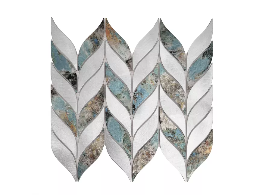 Mozaika o intrygującym, liściastym kształcie została wykonana na bazie szczotkowanego aluminium z efektem patyny i przeznaczona jest do montażu na ścianach.